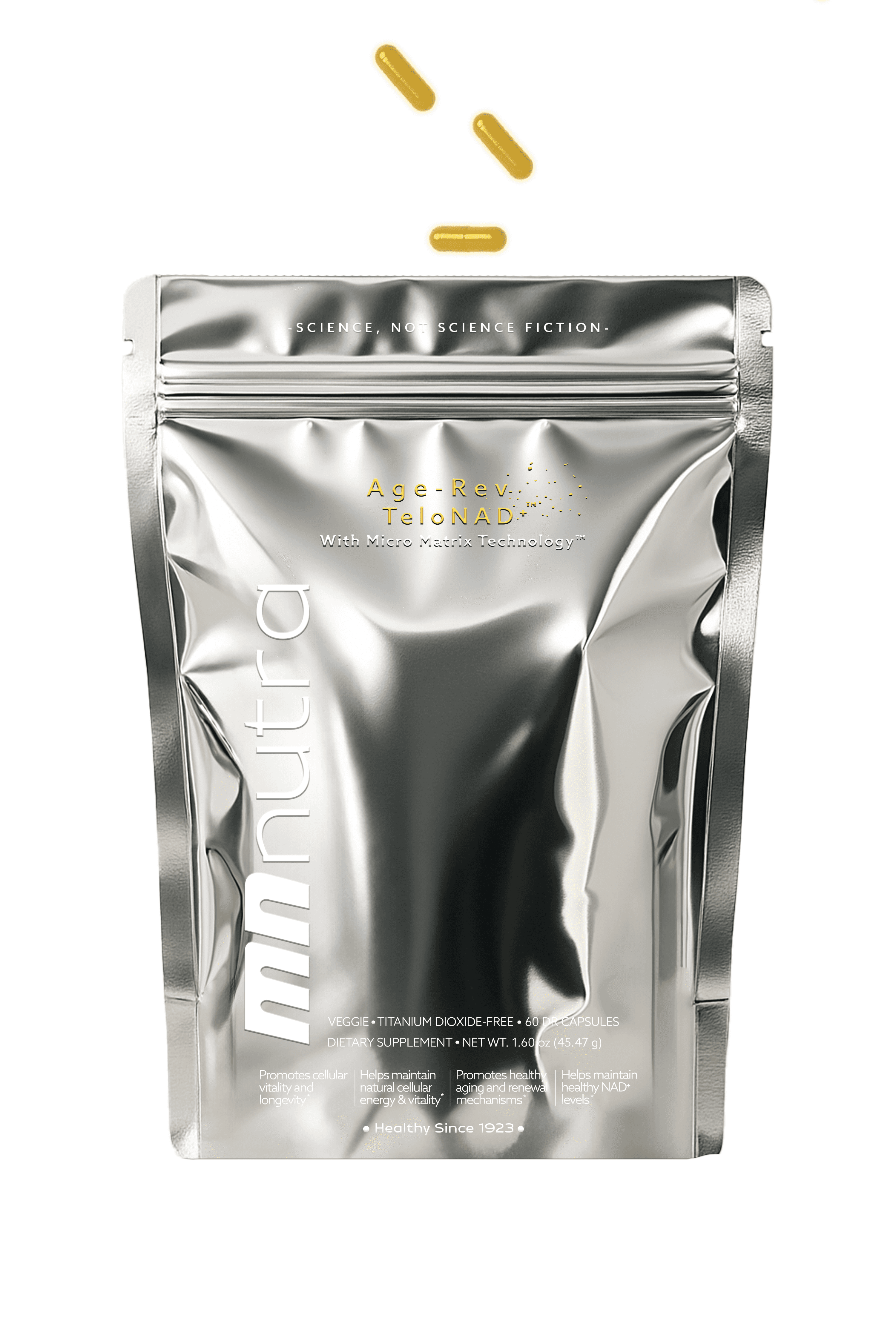 Age-Rev TeloNAD+™ is a cellular longevity formula designed to support telomere integrity, mitochondrial health, and age-related metabolic balance. Enabled by Micro Matrix Technology™, it promotes efficient nutrient delivery to support healthy aging, sustained energy, and cellular renewal.